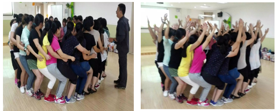 整個團隊圍成一個大圓圈,在教練的指導(dǎo)下所有人坐在后面人的腿上。