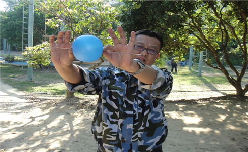 目標:把一只氣球吹到適宜大?。ń涍^上海拓展公司培訓師查看),用鐵絲從氣球的一端穿入,另一端穿出,鐵絲穿出后10秒不泄氣,即為項目挑戰成功