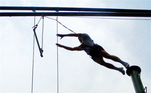 項目目標:每一位學員穿戴好安全保護的情況下,輪流爬到圓柱頂端,站在圓盤上,奮力躍出,去抓前方的單杠。